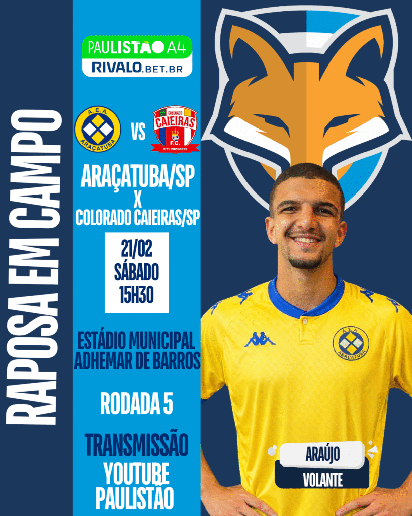 O volante Araújo está relacionado pelo Araçatuba/SP, que enfrenta o Colorado Caieiras/SP, neste sábado (21), às 15h30, no Estádio Adhemar de Barros. A partida é válida pela quinta rodada do Paulista A4.
