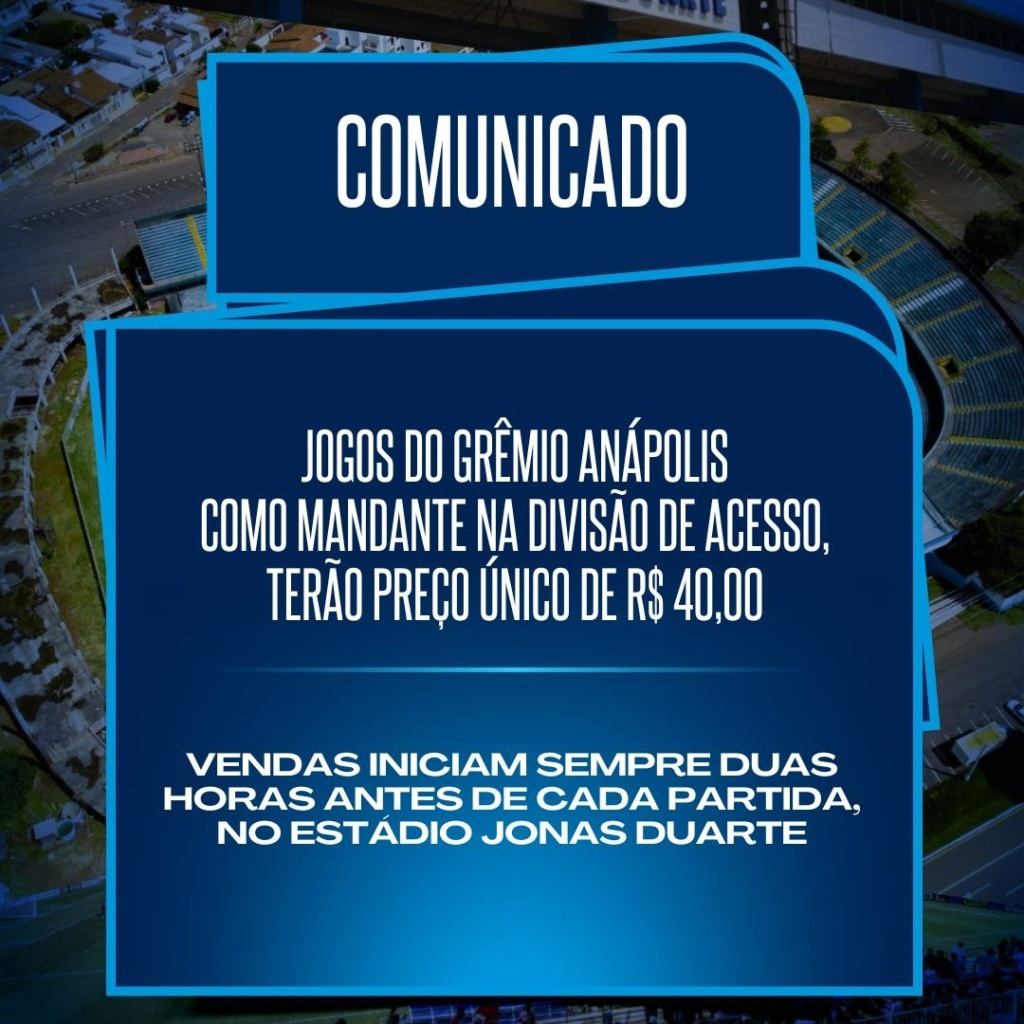 O Grêmio Anápolis comunica que os ingressos das partidas do clube como mandante, terão PREÇO ÚNICO no valor de R$ 40,00. As entradas serão para o setor de arquibancada coberta. As vendas iniciam sempre no Estádio Jonas Duarte, duas horas antes do início de cada partida.