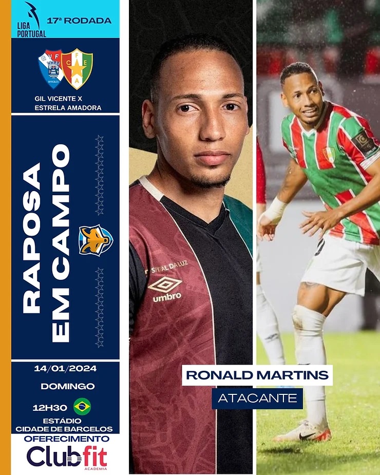 O atacante Ronald Martins inicia como titular neste domingo (14), pelo Estrela Amadora, diante do Gil Vicente, às 12h30, no Estádio Cidade de Barcelos, em Vila Boa. A partida é válida pela décima sétima rodada da Liga Portugal. A equipe do brasileiro ocupa o décimo primeiro lugar na tabela, com 17 pontos conquistados e quer subir para a parte de cima, onde estão os dez primeiros colocados. O confronto também marca a última rodada do primeiro turno e traz a oportunidade de melhorar a posição na tabela, antes do returno.
