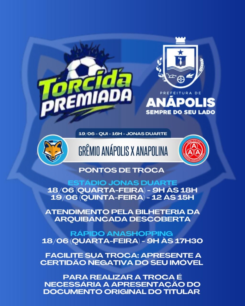 Confira a data, horário e locais das trocas de ingressos do Programa Torcida Premiada para o confronto entre Grêmio Anápolis x Anapolina, que acontece na próxima quinta-feira (19), às 16h, pela sexta rodada da Divisão de Acesso 2025.