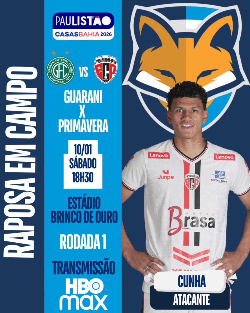 Hoje tem estreia de atleta da Raposa no Paulistão! O atacante Cunha está relacionado pelo Primavera/SP, para enfrentar o Guarani, às 18h30, no Estádio Brinco de Ouro, em Campinas/SP. A partida é válida pela primeira rodada da competição.