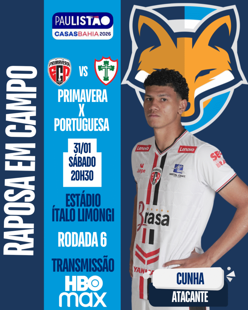 O atacante Cunha está relacionado pelo Primavera/SP, que enfrenta a Portuguesa, neste sábado (21), às 20h30, no Estádio Ítalo Limongi. A partida é válida pela sexta rodada do Goianão 2026.