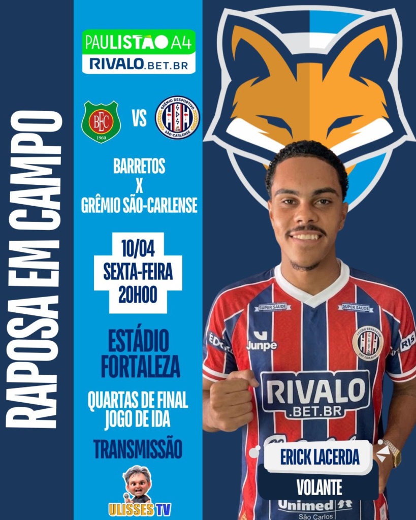 O volante Erick Lacerda (2004), está relacionado pelo Grêmio São-Carlense/SP, que enfrenta o Barretos/SP, nesta sexta-feira (10), às 20h00, no Estádio Fortaleza. A partida é válida pela quartas de final Paulistão A4.