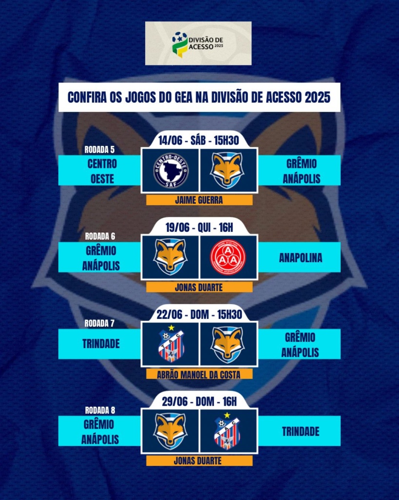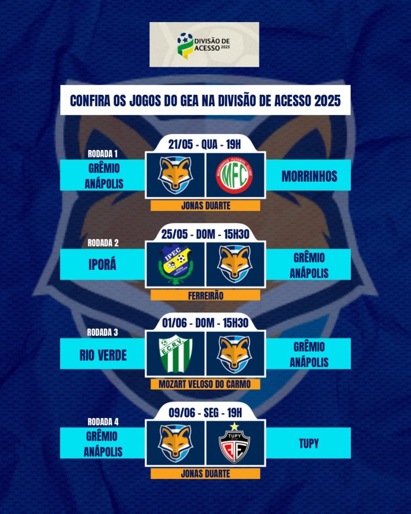 O Grêmio Anápolis estreia na Divisão de Acesso 2025, diante do Morrinhos, no dia 21 de maio, uma quarta-feira, às 19h, no Estádio Jonas Duarte, conforme tabela divulgada pela Federação Goiana de Futebol (FGF).