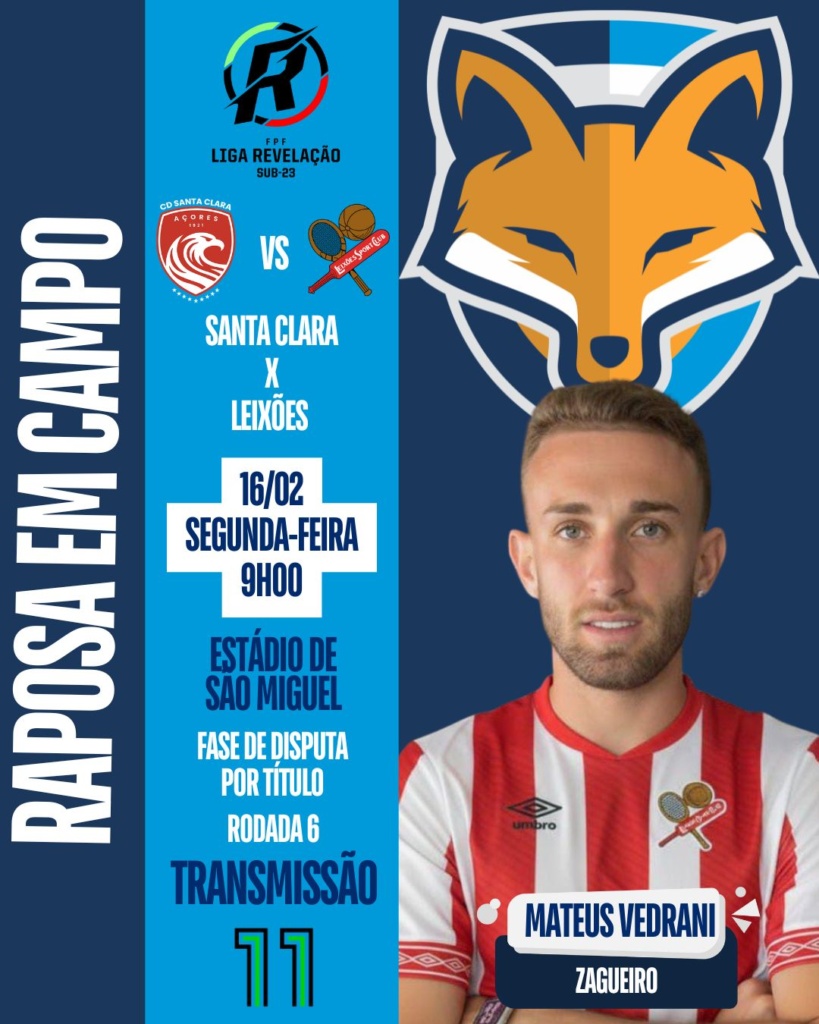 O zagueiro Mateus Vedrani está relacionado pelo Leixões, que enfrenta o Santa Clara, nesta segunda-feira (16), às 9h pelo Horário de Brasília, no Estádio de São Miguel. A partida é a sexta da fase de disputa por título da Liga Revelação sub-23.