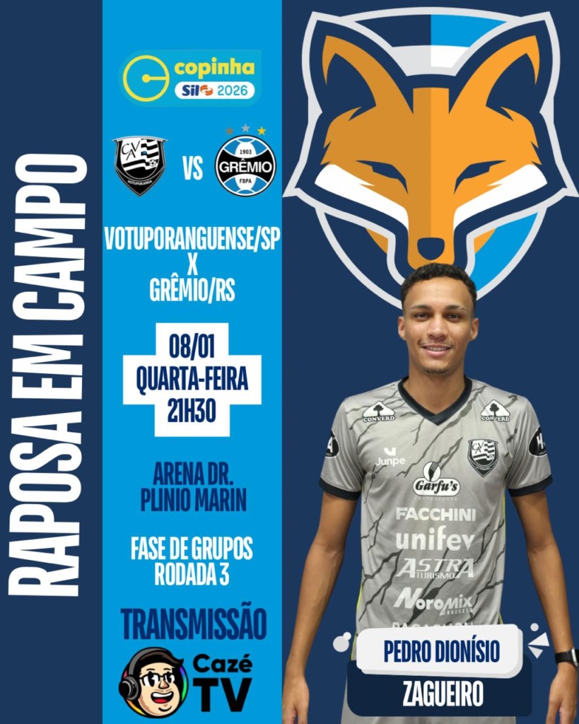 O zagueiro Pedro Dionísio volta a campo pelo Votuporanguense/SP, nesta quinta-feira (8), diante do Grêmio/RS, às 21h30, na Arena Dr. Plinio Marin. A partida é válida pela terceira rodada da Copa São Paulo 2026.