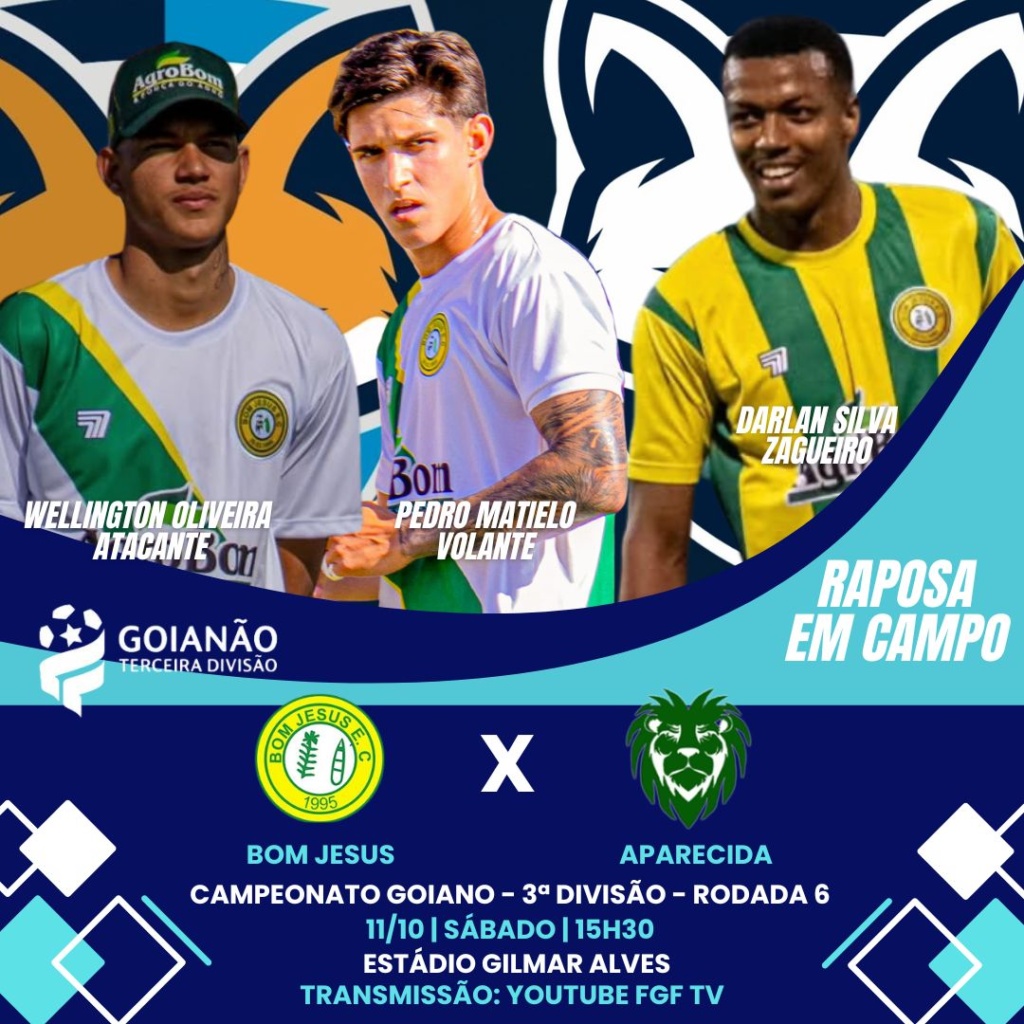 Já pela sexta rodada da terceira divisão Goiana profissional, o Bom Jesus do zagueiro Darlan Silva, do volante Pedro Matielo e do atacante Wellington Oliveira, joga diante do Aparecida, no Estádio Gilmar Alves, às 15h30.