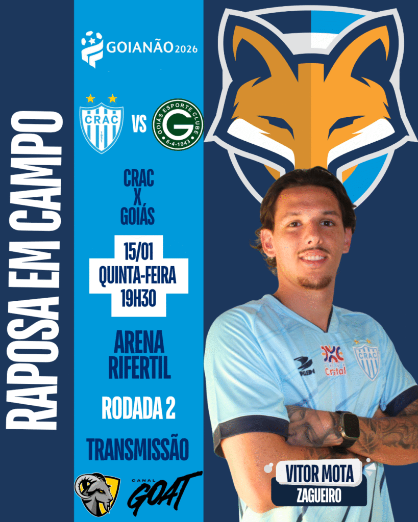 O zagueiro Vitor Mota está relacionado pelo Crac, que enfrenta o Goiás, na noite desta quinta-feira (15), às 19h30, na Arena Rifertil, em Catalão. A partida é válida pela segunda rodada do Goianão 2026.